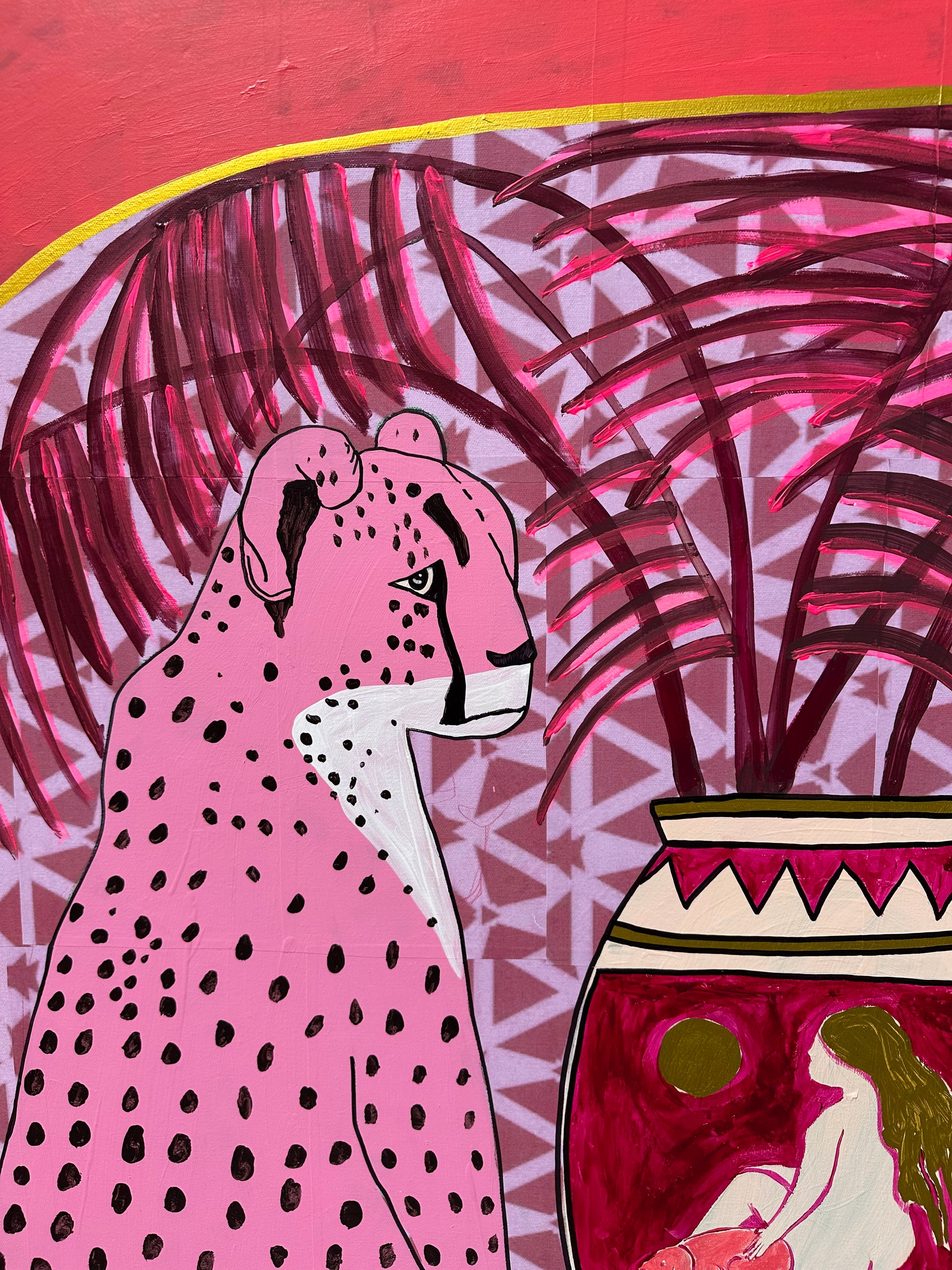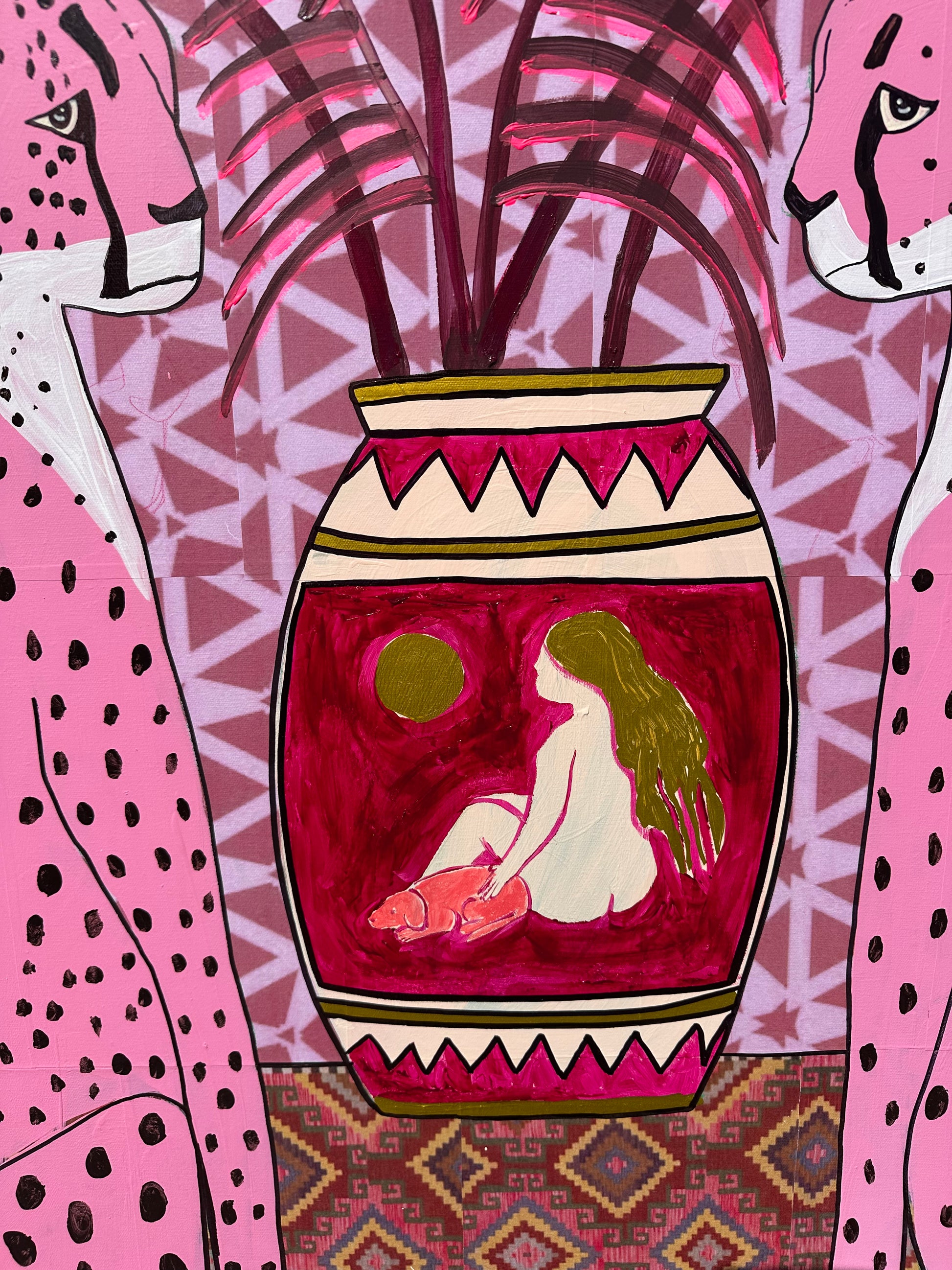 Stretched Canvas with Acrylic paint, collage and drawing. All artworks are varnished when complete.